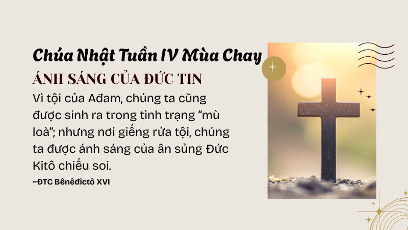 Hành trình Mùa Chay mà chúng ta đang thực hiện là một thời gian hồng ân đặc biệt, trong đó chúng ta có thể cảm nghiệm quà tặng lòng nhân hậu của Chúa dành cho mình. Phụng vụ Chúa Nhật này, được gọi là “Laetare,” mời gọi chúng ta vui mừng hoan hỷ, như ca nhập lễ của Thánh Lễ công bố: “Hãy vui mừng với Giêrusalem, hãy vì Thành Đô mà hoan hỷ, hỡi tất cả những người yêu mến Thành Đô! Hãy cùng Giêrusalem khấp khởi mừng, hỡi tất cả những người đã than khóc Thành Đô, để được Thành Đô cho hưởng trọn nguồn an ủi, được thoả thích nếm mùi sung mãn vinh quang, như trẻ thơ bú no bầu sữa mẹ.” (x. Is 66,10-11).