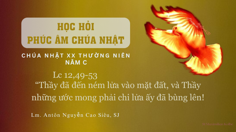 3. Trong Luca 12,49 Đức Giêsu nói mình đã đến ném lửa trên mặt đất và Ngài mong phải chi lửa ấy đã bùng lên! Chắc chắn đây không phải là thứ lửa trừng phạt hay tiêu diệt, mà là lửa thanh luyện, lửa đi với Phép Rửa trong Thánh Thần (Lc 3,16; Cv 2,3-4). Cũng có thể đây là thứ lửa đã làm trái tim nguội lạnh của hai môn đệ về Emmau bừng cháy lòng mến tin (Lc 24,32). Ngọn lửa ấy thực ra vẫn chưa bùng lên và tỏa lan trên toàn mặt đất. Đây vẫn là một ước mơ chưa tròn của Đức Giêsu và Ngài muốn chúng ta giúp Ngài thực hiện ước mơ ấy.