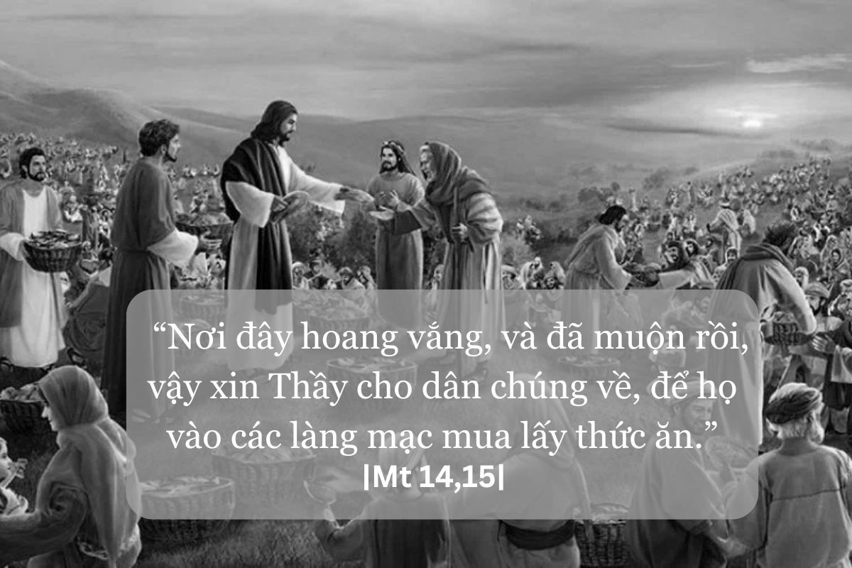 15 Chiều đến, các môn đệ lại gần thưa với Người: “Nơi đây hoang vắng, và đã muộn rồi, vậy xin Thầy cho dân chúng về, để họ vào các làng mạc mua lấy thức ăn.” 16 Đức Giê-su bảo: “Họ không cần phải đi đâu cả, chính anh em hãy cho họ ăn.” 17 Các ông đáp: “Ở đây, chúng con chỉ có vỏn vẹn năm cái bánh và hai con cá!” 18 Người bảo: “Đem lại đây cho Thầy!” 19 Sau đó, Người truyền cho dân chúng ngồi xuống cỏ. Người cầm lấy năm cái bánh và hai con cá, ngước mắt lên trời, dâng lời chúc tụng, bẻ ra, trao cho môn đệ, và môn đệ trao cho đám đông. 20 Ai nấy đều ăn và được no nê. Những mẩu bánh còn thừa, người ta thu lại được mười hai giỏ đầy. 21 Số người ăn khoảng chừng năm ngàn đàn ông, không kể đàn bà và trẻ con.