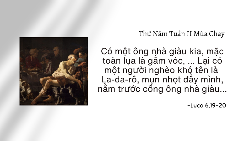 19 Khi ấy, Đức Giê-su nói với người Pha-ri-sêu dụ ngôn sau đây: “Có một ông nhà giàu kia, mặc toàn lụa là gấm vóc, ngày ngày yến tiệc linh đình. 20 Lại có một người nghèo khó tên là La-da-rô, mụn nhọt đầy mình, nằm trước cổng ông nhà giàu, 21 thèm được những thứ trên bàn ăn của ông ấy rớt xuống mà ăn cho no. Lại thêm mấy con chó cứ đến liếm ghẻ chốc anh ta. 22 Thế rồi người nghèo này chết, và được thiên thần đem vào lòng ông Áp-ra-ham. Ông nhà giàu cũng chết, và người ta đem chôn.
