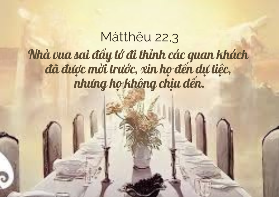Khi ấy, Đức Giê-su dùng dụ ngôn mà nói với các thượng tế và kỳ mục trong dân rằng: 2 “Nước Trời cũng giống như chuyện một vua kia mở tiệc cưới cho con mình. 3 Nhà vua sai đầy tớ đi thỉnh các quan khách đã được mời trước, xin họ đến dự tiệc, nhưng họ không chịu đến. 4 Nhà vua lại sai những đầy tớ khác đi, và dặn họ: ‘Hãy thưa với quan khách đã được mời rằng: Này cỗ bàn, ta đã dọn xong, bò tơ và thú béo đã hạ rồi, mọi sự đã sẵn. Mời quý vị đến dự tiệc cưới!’ 5 Nhưng quan khách không thèm đếm xỉa tới, lại bỏ đi: kẻ thì đi thăm nông trại, người thì đi buôn, 6 còn những kẻ khác lại bắt các đầy tớ của vua mà hành hạ và giết chết. 7 Nhà vua liền nổi cơn thịnh nộ, sai quân đi tru diệt bọn sát nhân ấy và thiêu huỷ thành phố của chúng. 8 Rồi nhà vua bảo đầy tớ: ‘Tiệc cưới đã sẵn sàng rồi, mà những kẻ đã được mời lại không xứng đáng. 9 Vậy các ngươi đi ra các ngả đường, gặp ai cũng mời hết vào tiệc cưới.’ 10 Đầy tớ liền đi ra các nẻo đường, gặp ai, bất luận xấu tốt, cũng tập hợp cả lại, nên phòng tiệc cưới đã đầy thực khách.