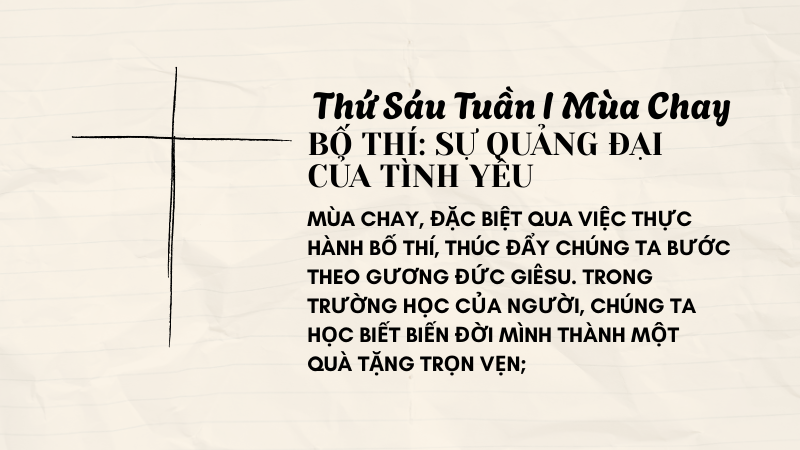 Anh chị em thân mến, Mùa Chay mời gọi chúng ta “rèn luyện” đời sống thiêng liêng, kể cả qua việc thực hành bố thí, để lớn lên trong đức ái và nhận ra chính Đức Kitô nơi người nghèo. Trong sách Công Vụ Tông Đồ, chúng ta đọc thấy thánh Phêrô nói với người què đang ngồi xin bố thí ở cửa Đền Thờ: “Vàng bạc thì tôi không có; nhưng cái tôi có, tôi cho anh đây: nhân danh Đức Giêsu Kitô Nadarét, anh hãy đứng dậy mà đi!” (Cv 3,6). Khi bố thí, chúng ta trao ban một điều gì đó thuộc về vật chất — như một dấu chỉ của hồng ân lớn lao hơn mà chúng ta có thể chia sẻ cho người khác: đó là việc loan báo và làm chứng cho Đức Kitô, Đấng duy nhất mang lại sự sống đích thực. Ước gì thời gian này được ghi dấu bằng nỗ lực cá nhân và cộng đoàn nhằm gắn bó mật thiết hơn với Đức Kitô, để chúng ta trở nên những chứng nhân cho tình yêu của Người.