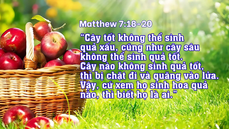 15Khi ấy, Đức Giê-su nói với các môn đệ rằng: “Anh em hãy coi chừng các ngôn sứ giả, họ đội lốt chiên mà đến với anh em; nhưng bên trong, họ là sói dữ tham mồi. 16Cứ xem họ sinh hoa quả nào, thì biết họ là ai. Có người nào lại hái nho ở bụi gai hay là hái vả trên cây găng? 17Nên hễ cây tốt thì sinh quả tốt, cây sâu thì sinh quả xấu. 18Cây tốt không thể sinh quả xấu, cũng như cây sâu không thể sinh quả tốt. 19 Cây nào không sinh quả tốt, thì bị chặt đi và quăng vào lửa. 20 Vậy, cứ xem họ sinh hoa quả nào, thì biết họ là ai.”