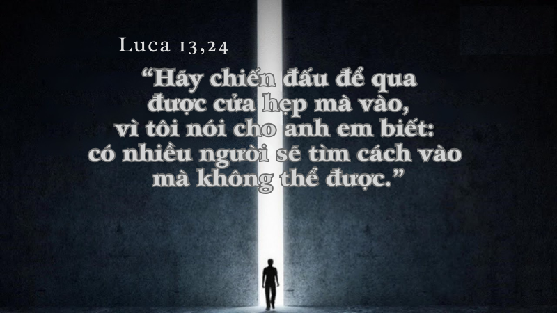 Đức Giêsu khuyên dạy các môn đệ và dân chúng muốn vào Nước Trời cần phải nỗ lực đi qua cửa hẹp. Không có vinh quang nào mà không đòi sự hy sinh. Hình ảnh “cửa hẹp” vừa diễn tả những khó khăn, thử thách trong cuộc sống vừa miêu tả sự chiến đấu thiêng liêng trước những cám dỗ mà con người cần vượt qua. Cho nên việc vào Nước Trời không nhờ sự quen biết, nhưng nhờ nỗ lực nên thánh của bản thân mỗi người. Đức Giêsu đã minh chứng điều này qua dụ ngôn người chủ nhà đứng dậy và đóng cửa thì không ai được vào nữa.